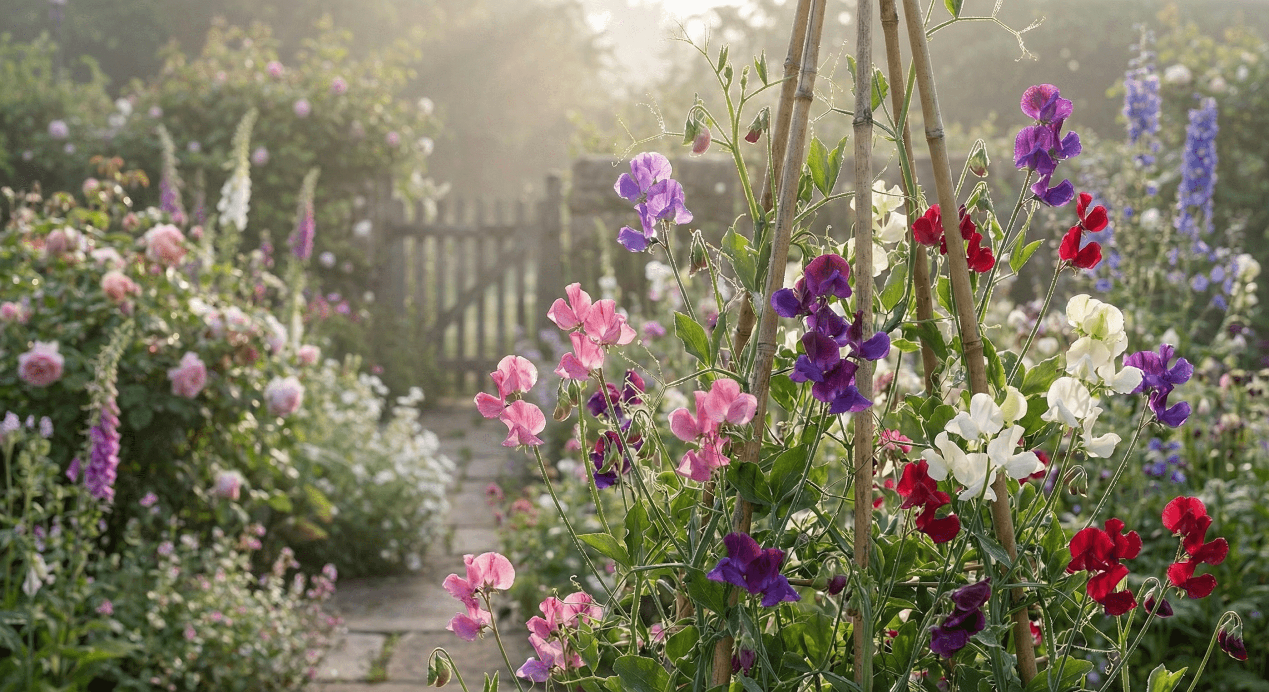 - Bamboo wigwams or trellis — sweet peas need something to climb