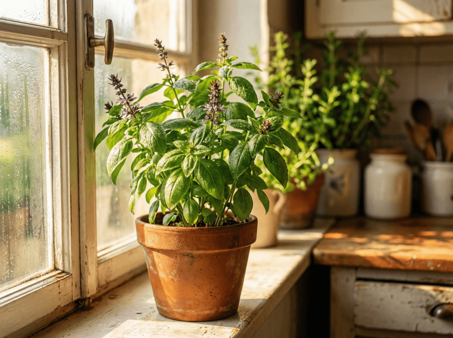 Yes — a south or east-facing windowsill is ideal. Keep it close to the glass (cold window panes can damage leaves in winter), and turn the pot regularly for even growth. Indoor basil needs at least 6 hours of direct sunlight.